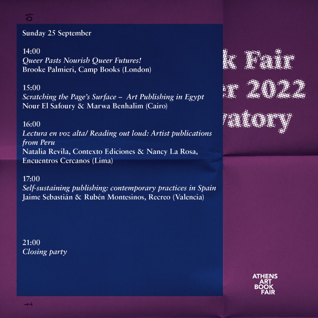 Οι ομιλήτριες θα προσφέρουν μια συνολική εικόνα της καλλιτεχνικής εκδοτικής πρακτικής στην Αίγυπτο, θα παρουσίασουν το πρότζεκτ Esmat Publishers και θα μοιραστούν τις γνώσεις του σχετικά με τις περιπλοκότητα του να ξεκινήσουν μια ανεξάρτητη φουάρ βιβλίου στην Αίγυπτο.
