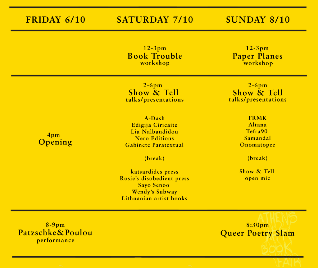 4 χρόνια μετά το πρώτο Athens Art Book Fair η ομάδα του poerty slam επιστρέφει στο θεσμό ως βοηθητική ΜΠΑΤΑΡΙΑ στον μηχανισμό της μεγαλύτερης διοργάνωσης καλλιτεχνικών εκδόσεων της αθήνας.