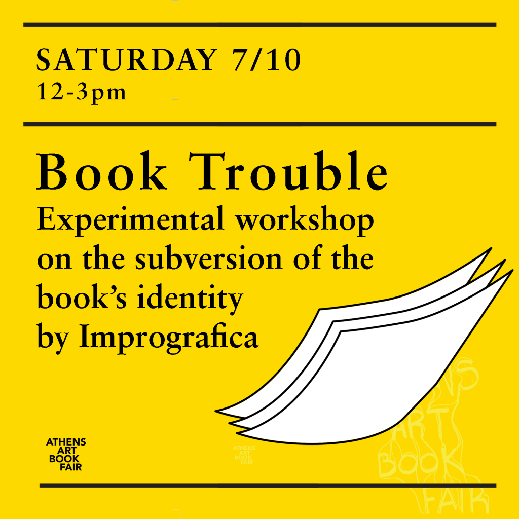 Στο Athens Art Book Fair 2023 για λίγες ώρες στήνεται ένα μικρό παρασκευαστήριο καλλιτεχνικών βιβλίων. Δηλαδή βιβλίων σε αναταραχή. Βιβλία που θα ήθελαν να είναι έργα τέχνης, έργα τέχνης που θα ήθελαν να είναι βιβλία, έργα τέχνης και βιβλία που θα ήθελαν να είναι κάτι άλλο.