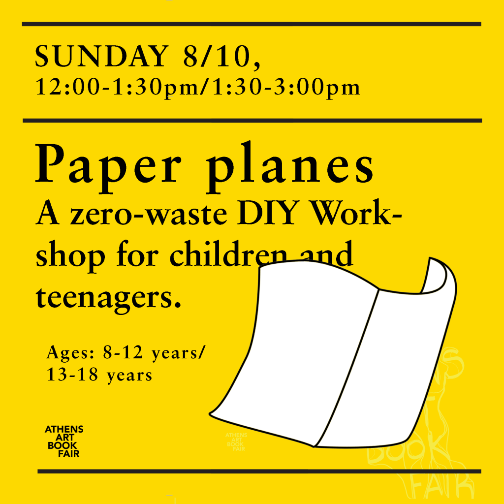 Paper Planes is a creative workshop of artist book and fanzine making aimed at childrenand teenagers, presented as part of the public program of the Athens Art Book Fair.In collaboration with On Materials, a platform dedicated to the collection and creativereuse of materials from artistic productions, we will experiment with a wide range of recyclable paper materials and bookbinding methods. We will also learn the history ofthe artist book and attempt to create our own.